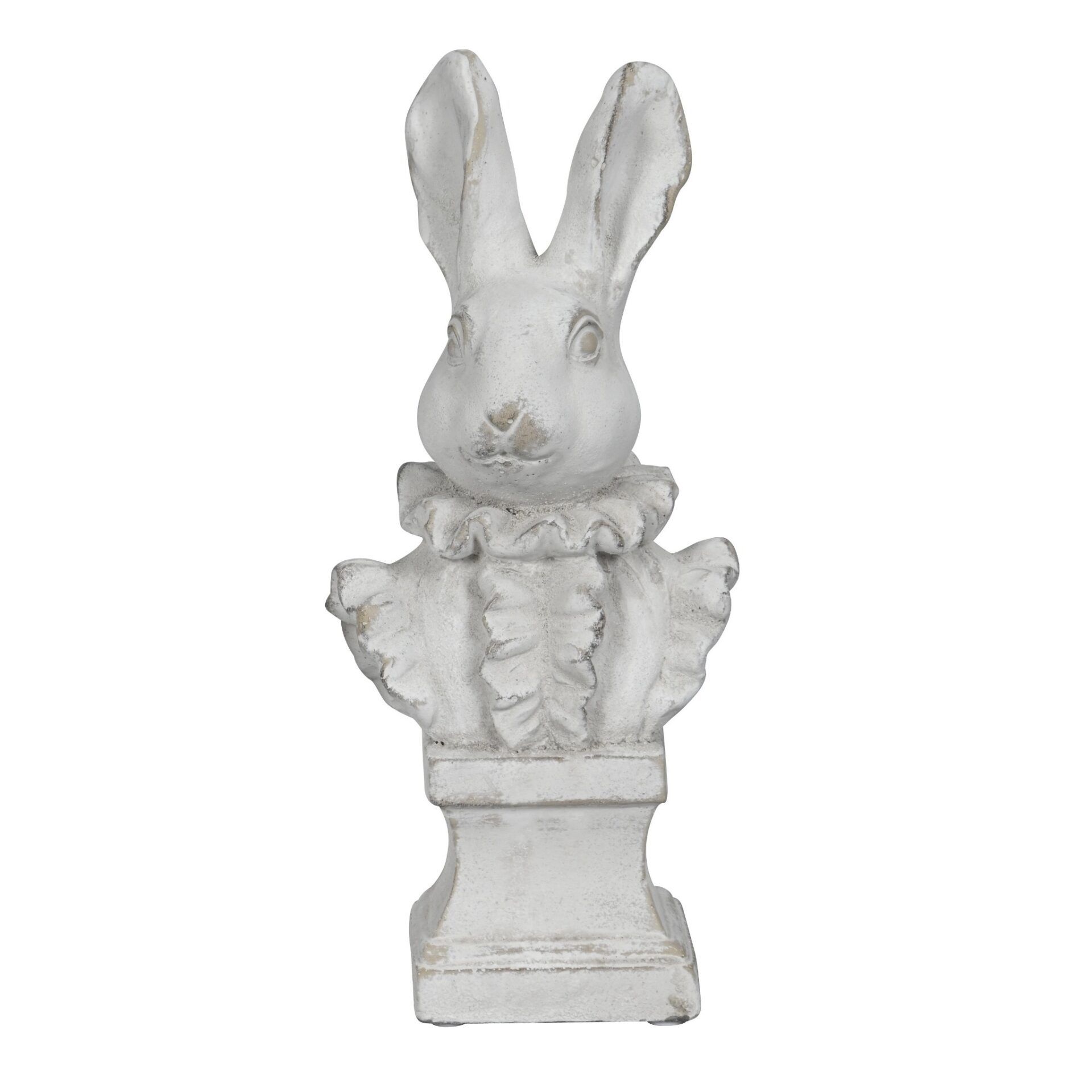Stilvolle Hasenbüste aus Zement in Weiss-Grau. Für drinnen und draussen geeignet – auf dem Sockel mit Krausekragen ein besonderer Hingucker.