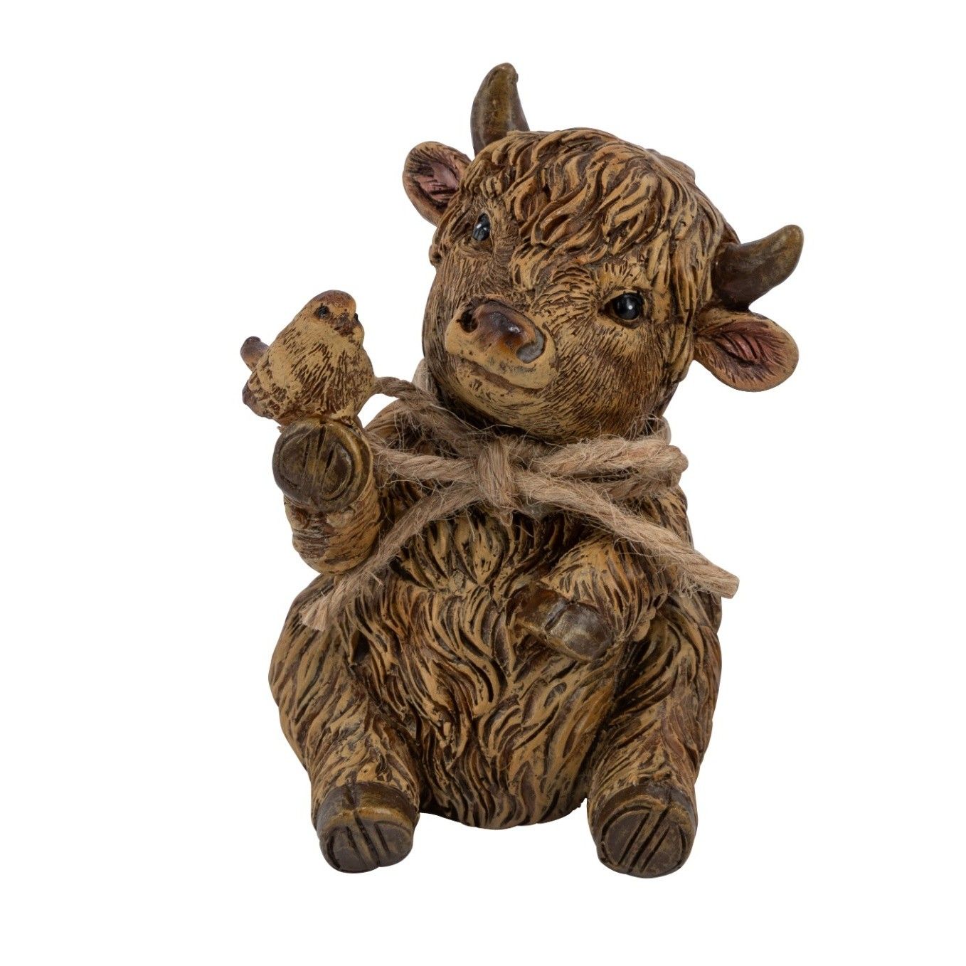 Herzige Hochlandrind-Dekofigur aus Poly-Yak, verziert mit Naturkordel.