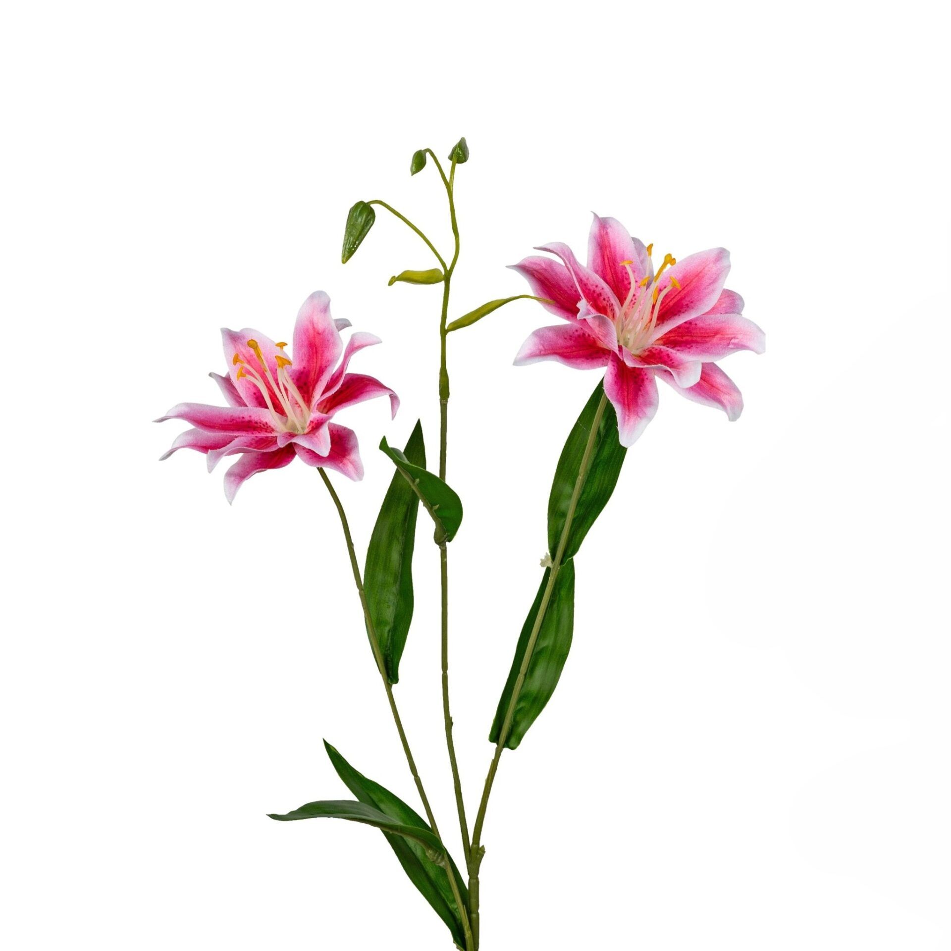 Wunderschöne Lilie in pink mit grossen Blüten, Knospen und grünen Blätter.