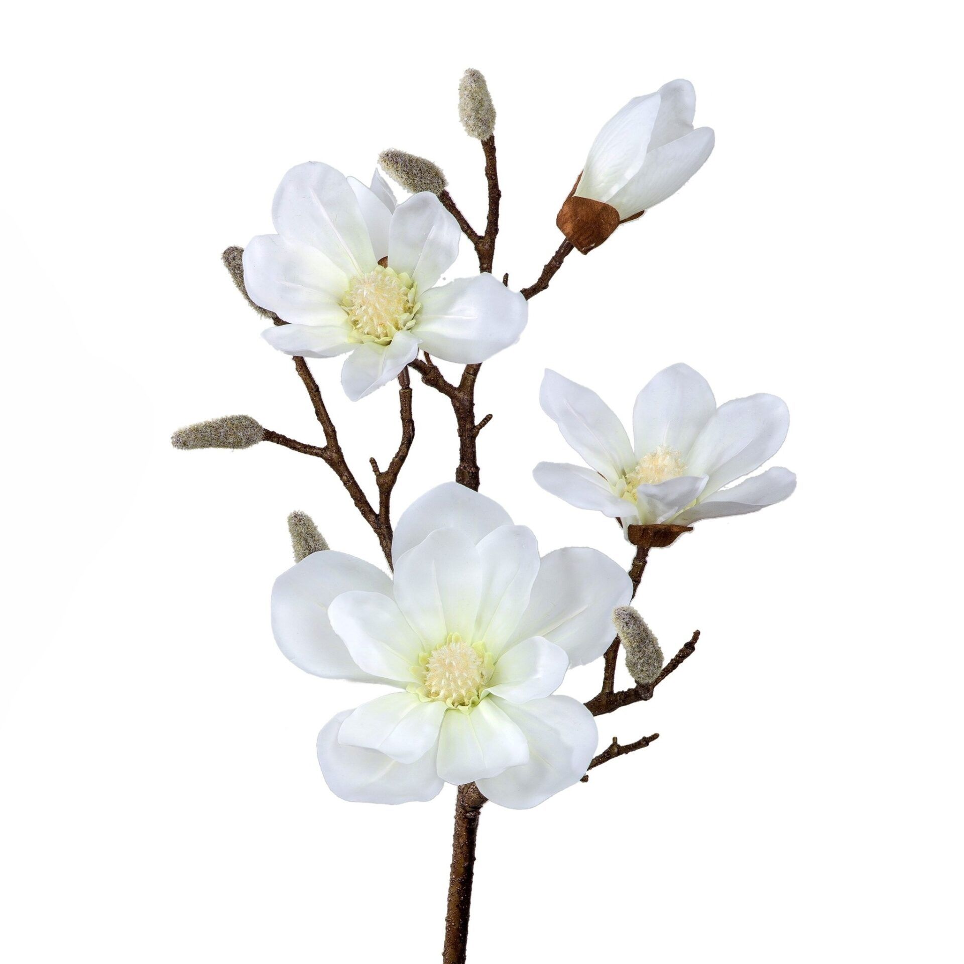 Magnolien-Zweig in Weiss. Diverse Blüten in verschiedenen Grössen und Knospen in samtweicher Ausführung zieren diesen schönen Ast. Sie lassen sich super mit den anderen Zweigen kombinieren und ergeben als Ganzes ein tolles Blumenbouquet in einer grossen Vase.