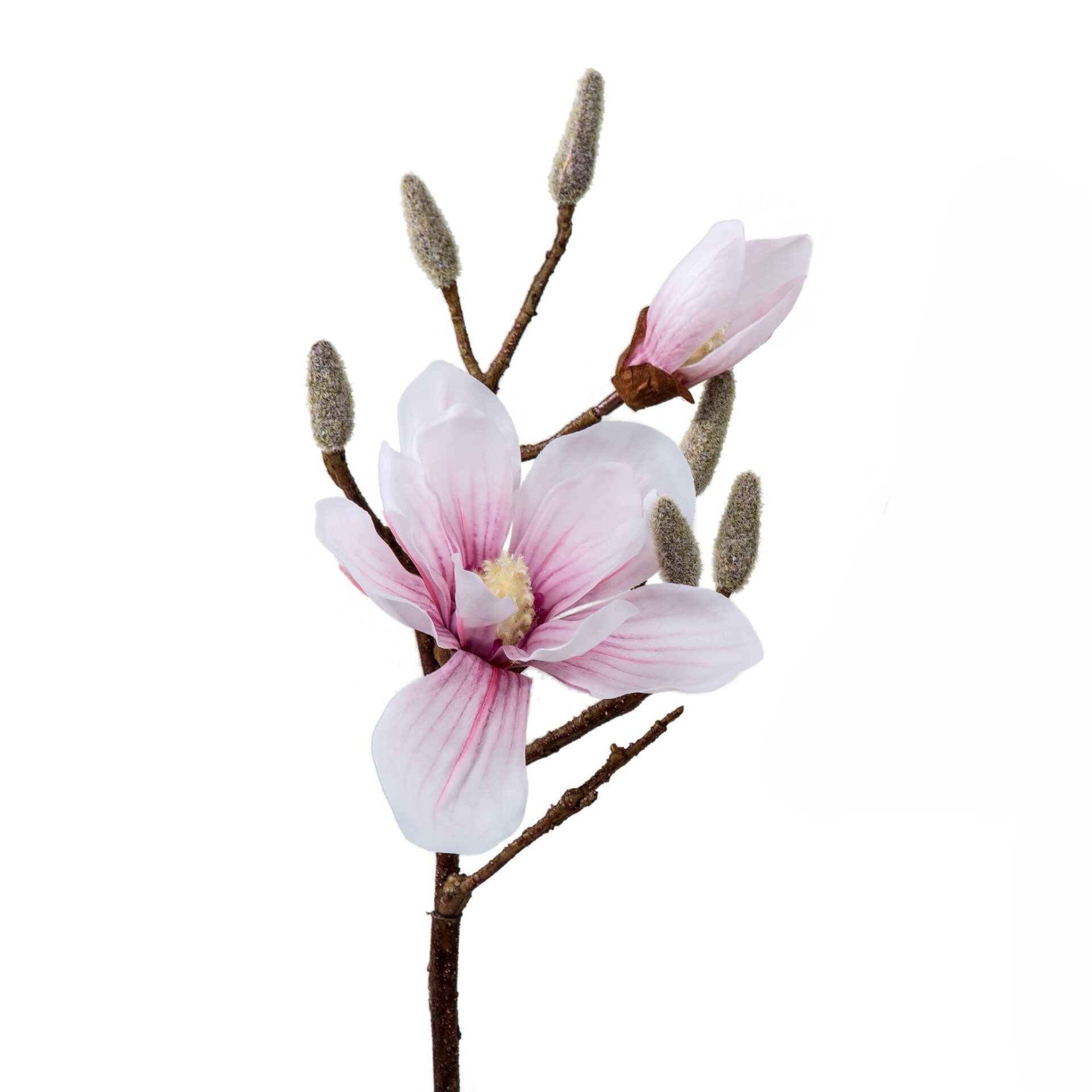 Magnolien-Zweig in Weiss-Rosa. Zwei Blüten in verschiedenen Grössen und Knospen in samtweicher Ausführung zieren diesen schönen Ast. Sie lassen sich super mit den anderen Zweigen kombinieren und ergeben als Ganzes ein tolles Blumenbouquet in einer grossen Vase.