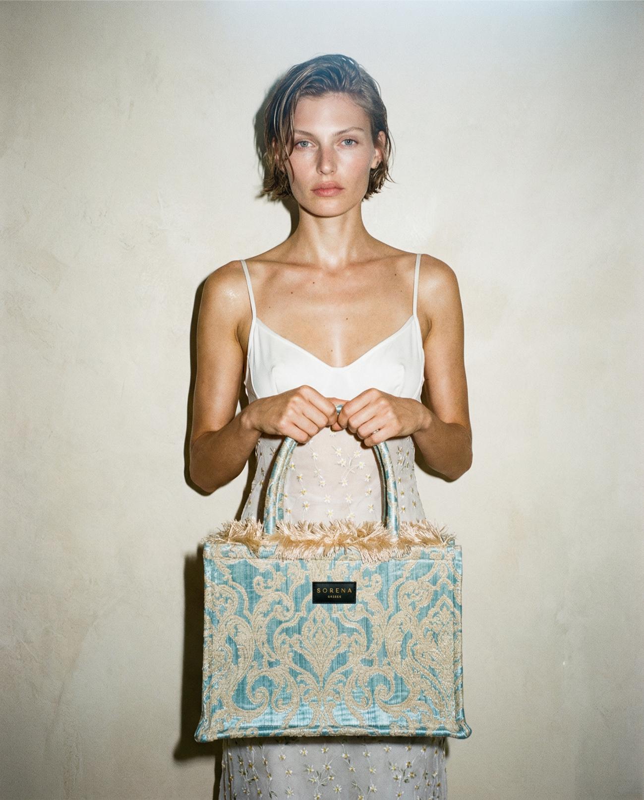Hellblau wie das Meer und zart schimmernd mit goldenen Akzenten. Das edle Strukturmuster in Beige zeigt sich auf der Dioni Tote Bag von Sorena.