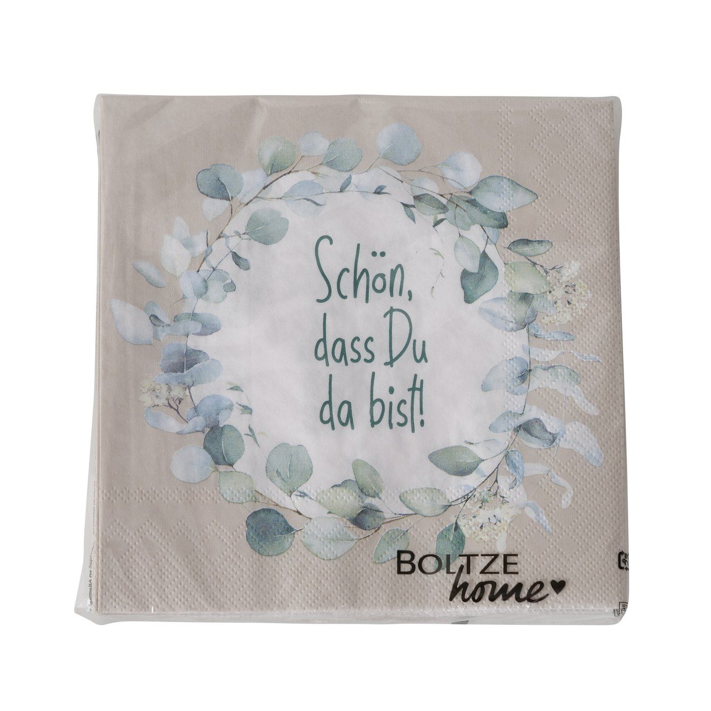 Schöne Papierserviette "Schön, dass Du da bist!" mit einem Eukalyptuskranz. Diese Serviette passt zu jedem Anlass.