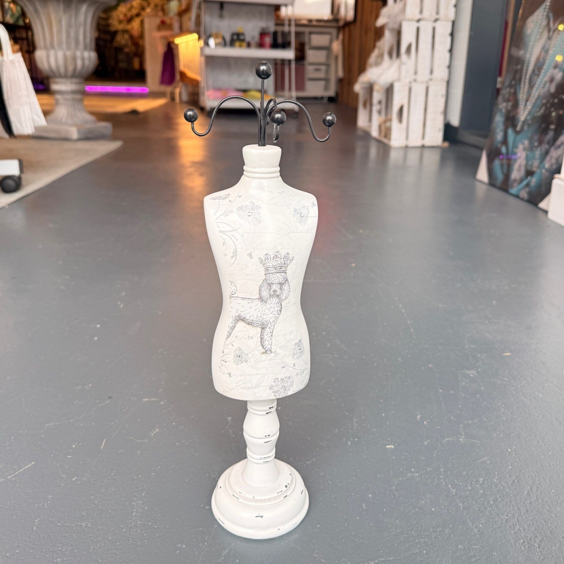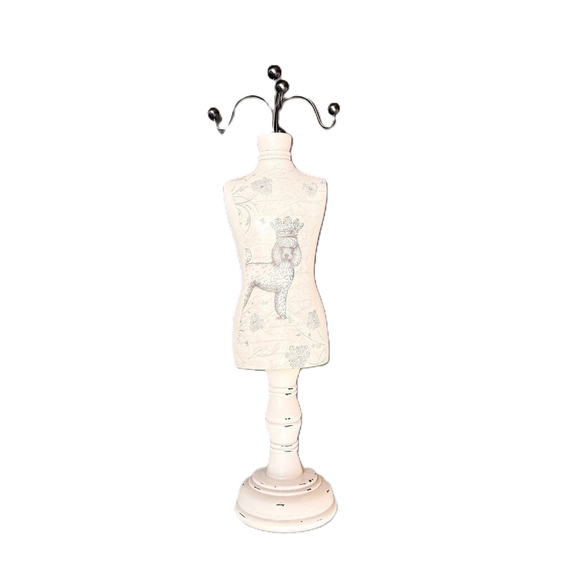 Ein schöner hoher Schmuckständer in Form einer Büste mit einem Pudel aufgedruckt. Dazu zieren Glitzersteine das Motiv. Perfekt für Armbänder und Halsketten.