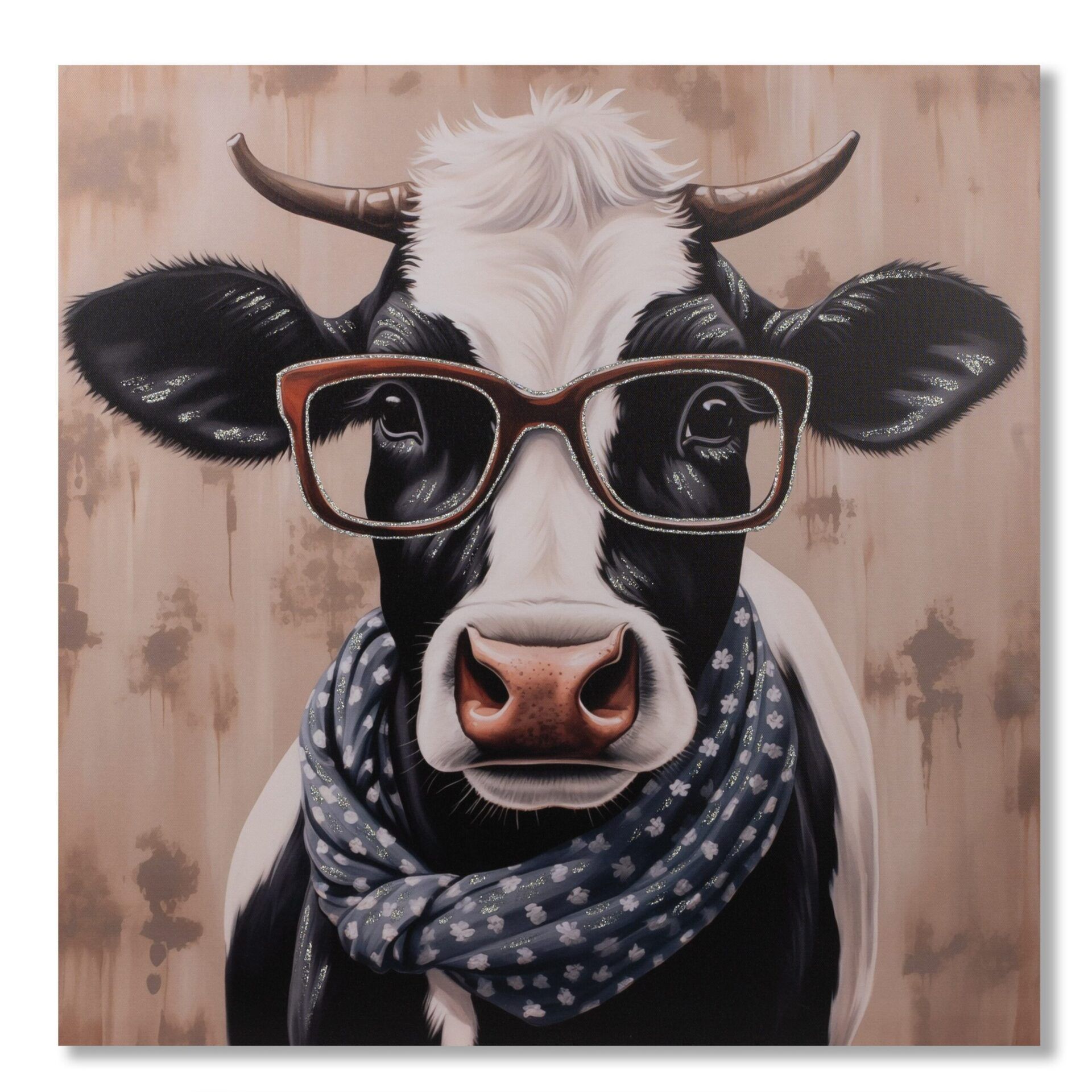 Ausdrucksstarkes Wandbild mit einer Kuh mit Brille und Halstuch. Wenig silberne, glitzende Akzente verleihen dem Bild eine besondere Wirkung.