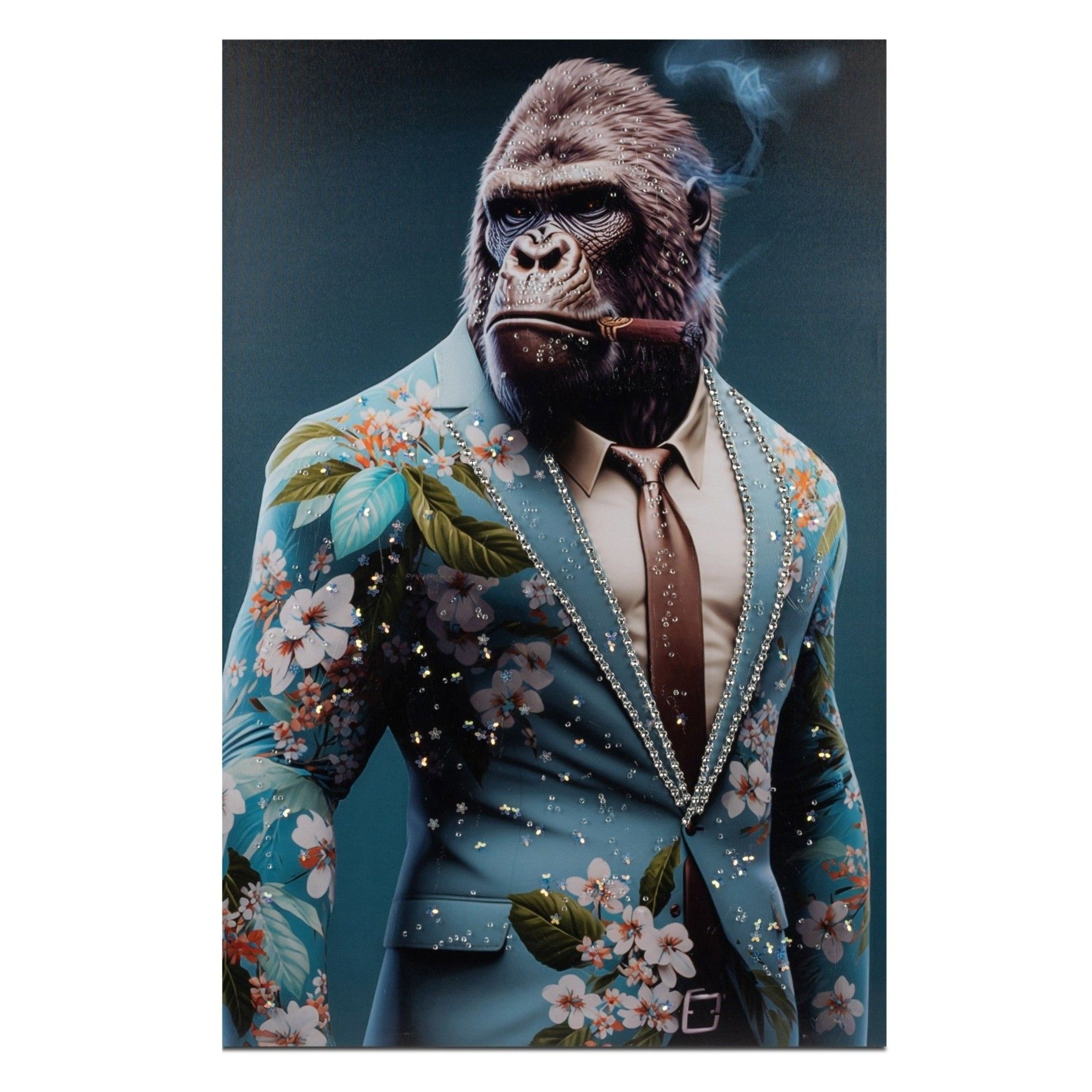 Ausdrucksstarkes Wandbild mit einem Gorilla im blauen Anzug. Grimmig raucht er eine Zigarre. Funkelnde Acrylsteine verleihen dem Bild eine besondere Wirkung.